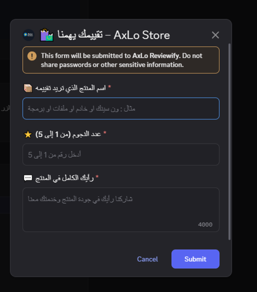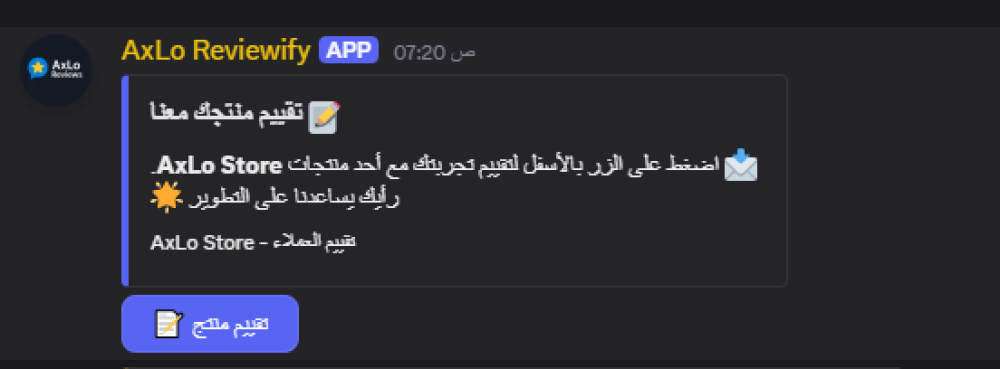 🔥 مميزات بوت التقييم (AxLo Reviewify): ✅ 1. نموذج تقييم تفاعلي يطلب اسم المنتج، عدد النجوم، وتعليق العميل. ✅ 2. تصميم أنيق لرسائل التقييم ألوان + رموز + صورة الشعار + ملاحظات تلقائية. ✅ 3. فلترة حسب الرتبة فقط من لديهم رتبة محددة يمكنهم إرسال تقييم. ✅ 4. رد خاص (DM) تلقائي شكر تلقائي في الخاص لكل من يرسل تقييم. ✅ 5. حفظ التقييمات تلقائيًا يتم حفظ كل تقييم داخل ملف reviews.json. ✅ 6. دعم روابط المنتجات عند تطابق اسم المنتج، يظهر رابط الشراء تلقائيًا. ✅ 8. دعم اللغة العربية بالكامل كل النصوص، الرموز، والواجهة باللغة العربية. 📦 متطلبات التشغيل :بوت ديسكورد مفعّل Node.js على أي VPS أو جهاز رفع الملفات وتشغيل start.bat